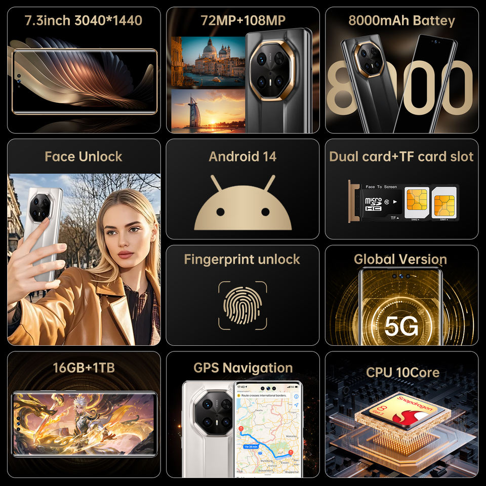 Mate70 RS 7.3 Pulgadas Compatible con Google, Whatsapp, Facebook, Teléfono Celular Original Desbloqueado, el Más Pequeño para Teléfonos Móviles