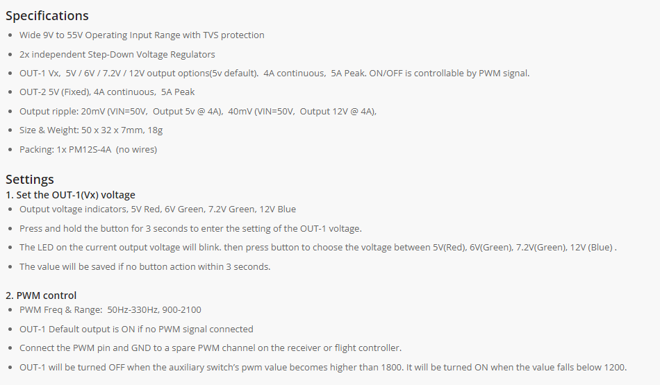 Módulo de Alimentación Mateksys PM12S-4A, Entrada de 9-55V, Doble BEC, Salida de 5V/5-12V, 4A Continuos para Aeronaves RC a Gran Escala y Cineplataformas