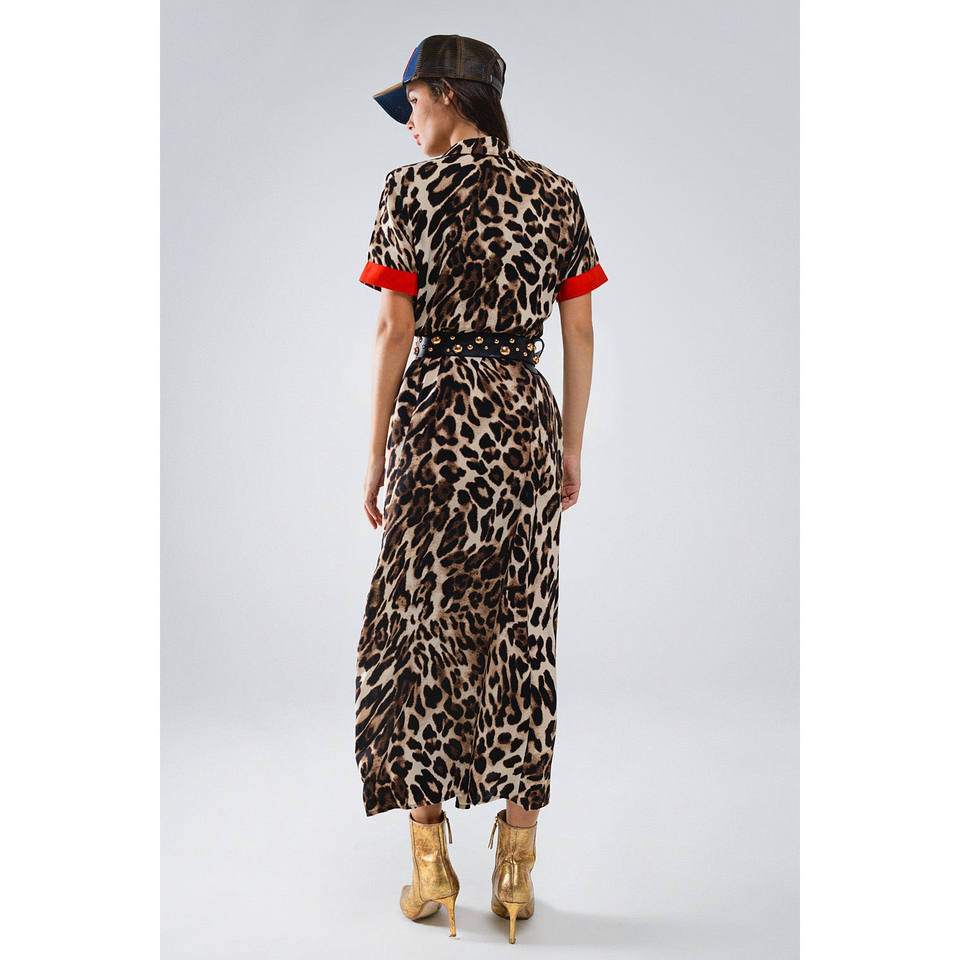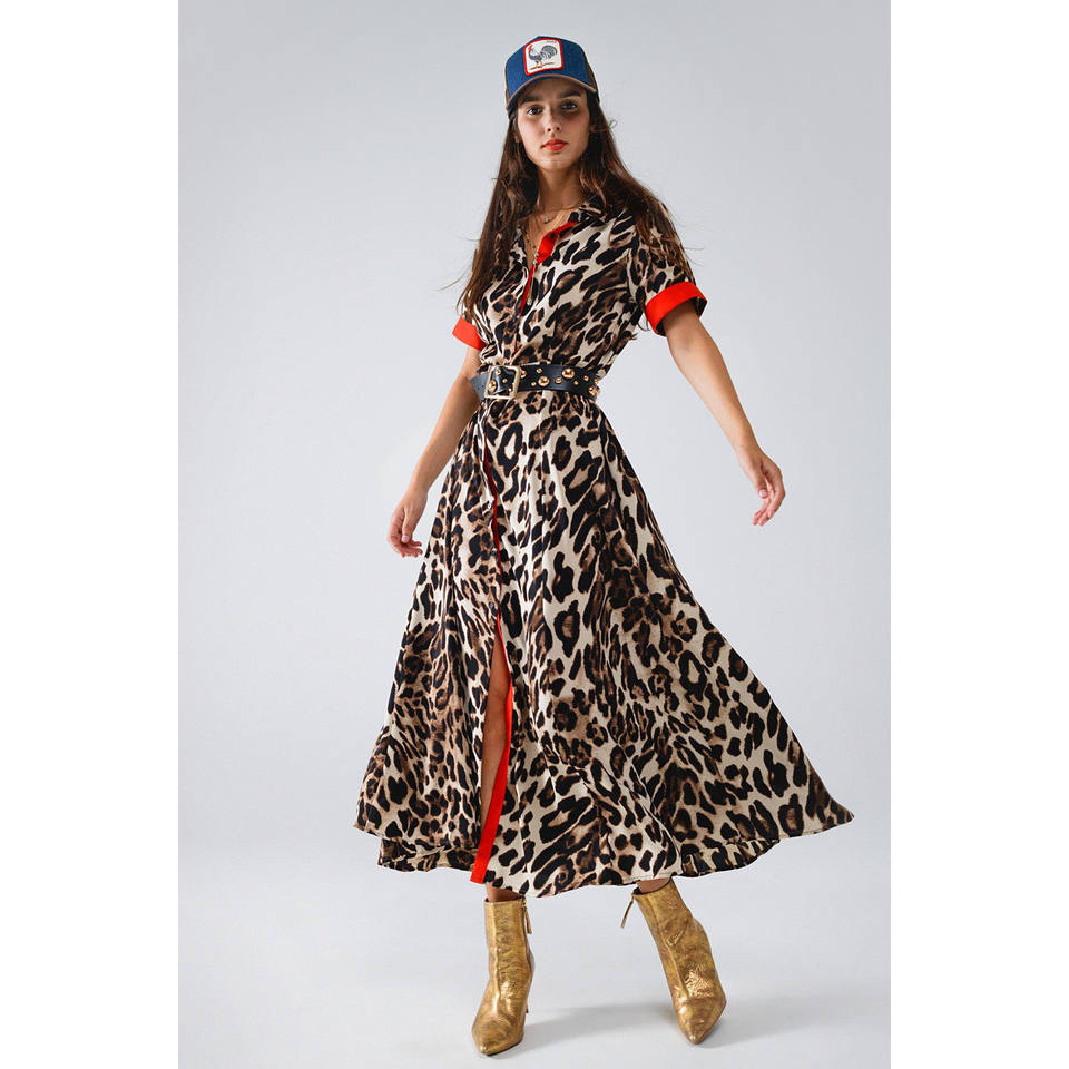 Vestido Maxi con Botones y Detalles Rojos con Estampado de Leopardo