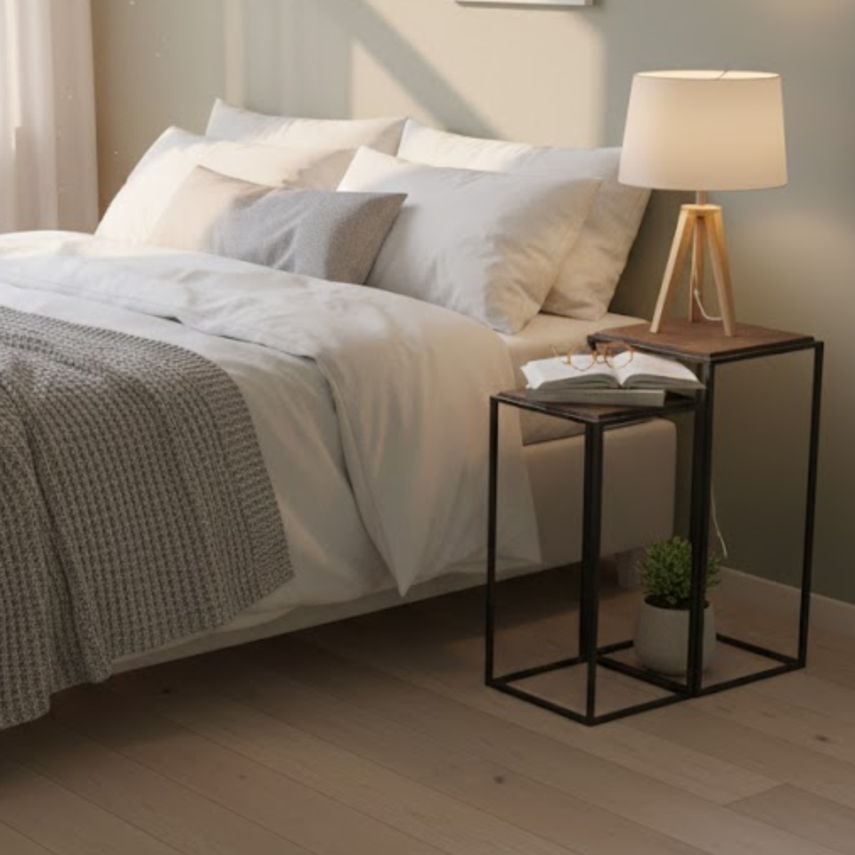 Juego de mesas auxiliares contemporáneas Maya | Estructura Metálica Resistente con Superficie de Madera para Sala de Estar, Dormitorio, Balcón y Oficina