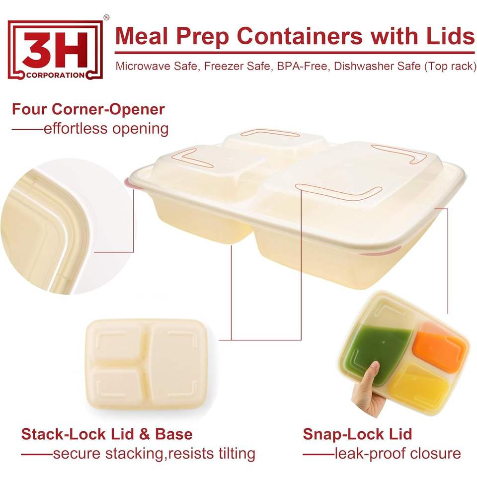 150 juegos de recipientes de preparación de comidas de 33 oz con 3 compartimentos y tapasComponentes Incluidos