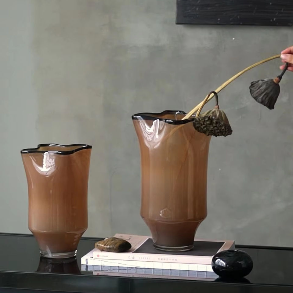 Jarrón de cristal de polvo de porcelana de café de boca grande hecho a mano con pliegues creativos de borde negro Medieval, jarrón de cristal de encimera de entrada