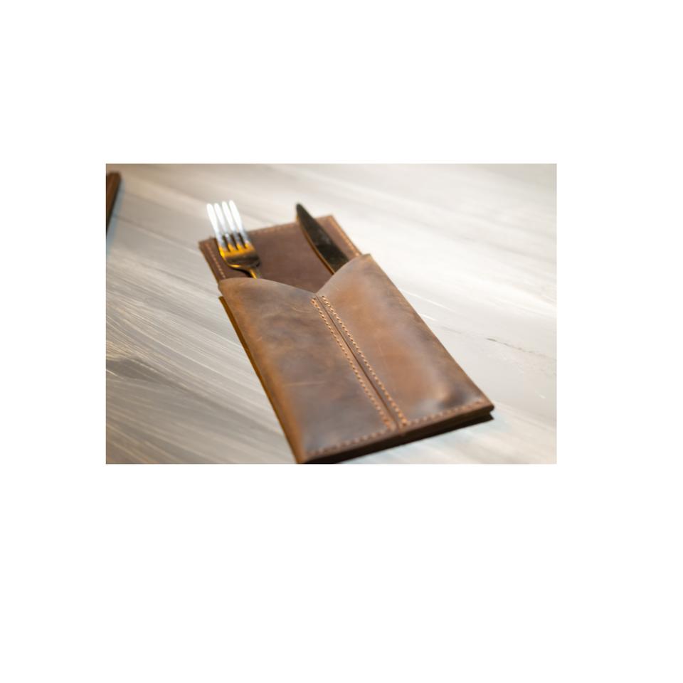 Juego de soporte para cuchara de cuero medieval, 3 piezas, cubiertos, cuchillo, tenedor, cuchara, estuche de cuero, bolsa de almacenamiento con producto de venta