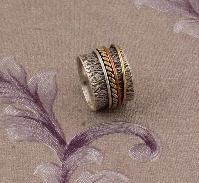Anillo giratorio de Plata de Ley 925, pieza de pulgar de meditación de tres tonos Vintage única, joyería de boda de la colección Silver & Gold