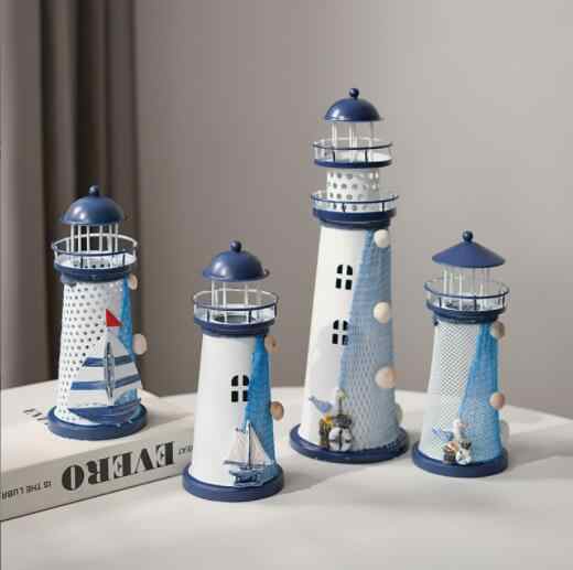 Faro de Hierro Estilo Mediterráneo, Decoración LED para Faro, Decoración Creativa de Escritorio, Faro con Viento Oceánico