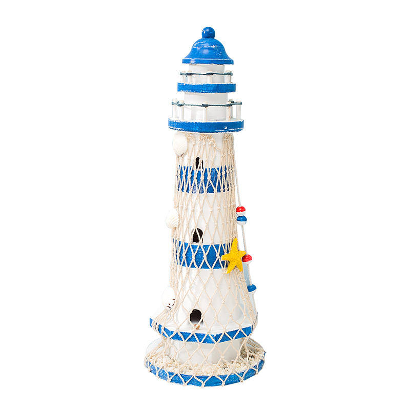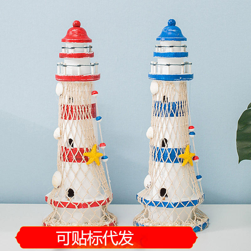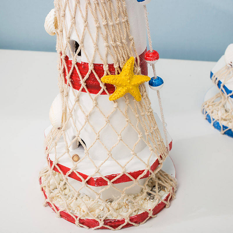Faro de Estilo Mediterráneo de 40 cm, Rojo y Azul, Madera Maciza, Hecho a Mano, Decoración para el Hogar, Decoración para Sala de Estar