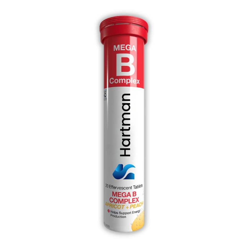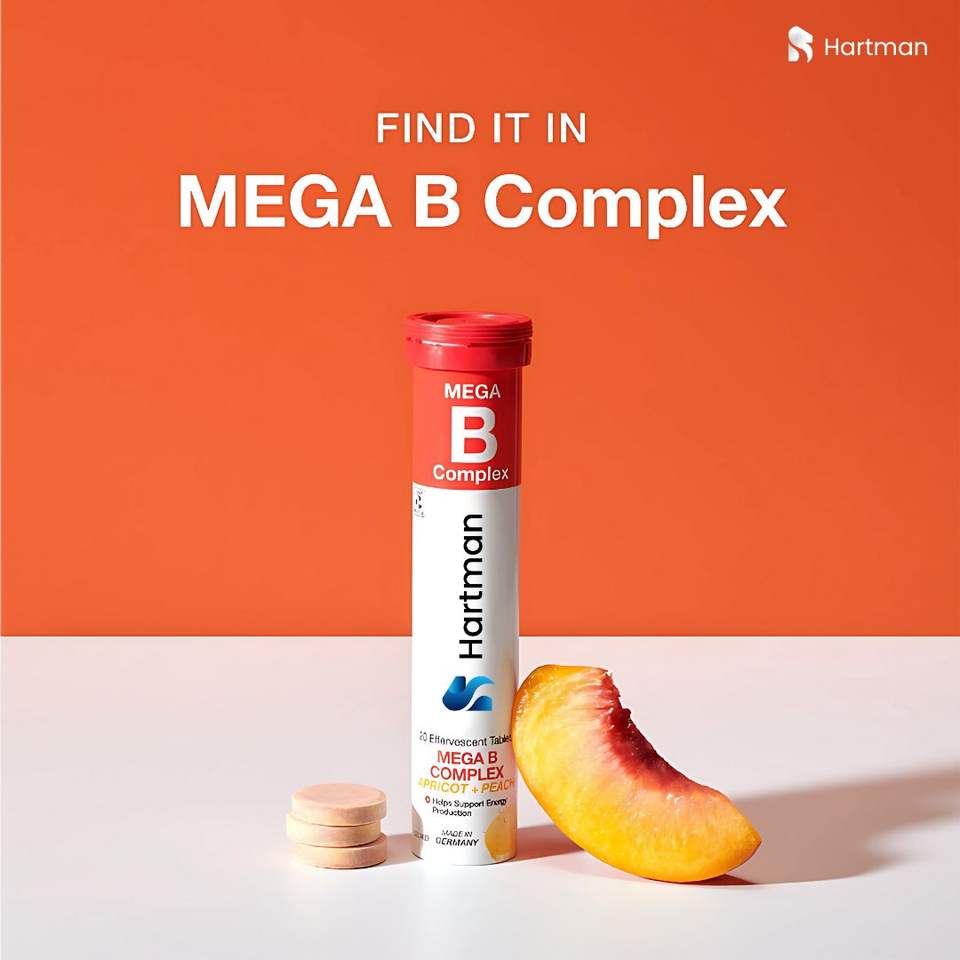 Mega Complejo B en Tabletas Efervescentes, 20 Unidades, Sabores a Albaricoque y Melocotón, Apoyo Energético para Adultos y Adolescentes, Cápsulas en Polvo