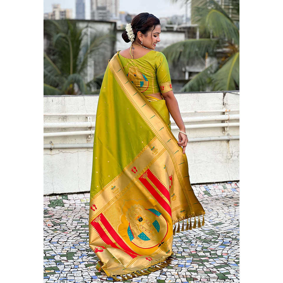Sari de Seda Paithani Tejido con Hilo Verde Zari, Diseño Mahalaxmi God Mehendi de Elite Weaves, Vestido de Noche