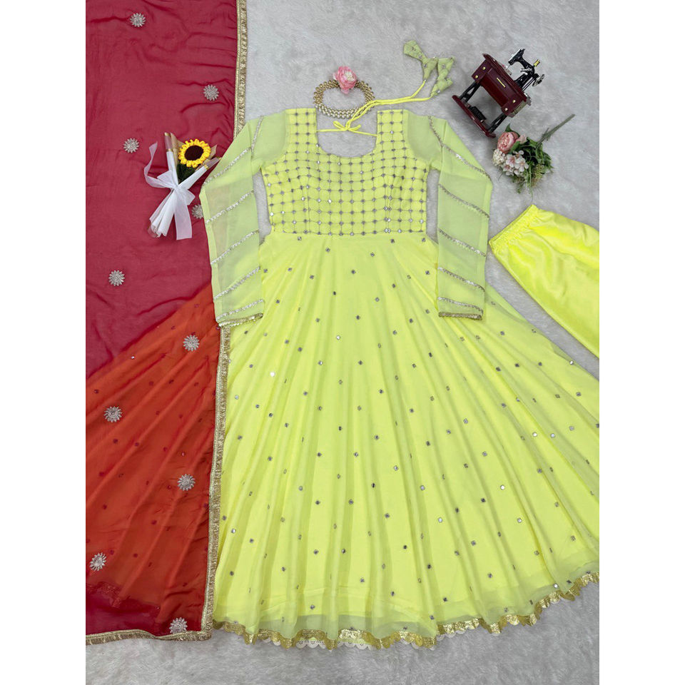 Mehr Top de Georgette de imitación Grace sin costuras, Pantalón de algodón con detalle de lentejuelas de 51 pulgadas de altura, trabajo de encaje, Dupatta, talla M a XXL