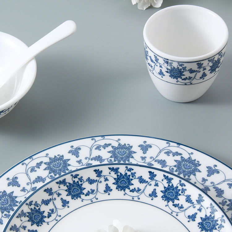 Juego de platos de melamina para cena, vajilla de plástico azul y blanco real China, Kit de tazas de plástico esmaltadas, respetuosas con el medio ambiente, más de 10
