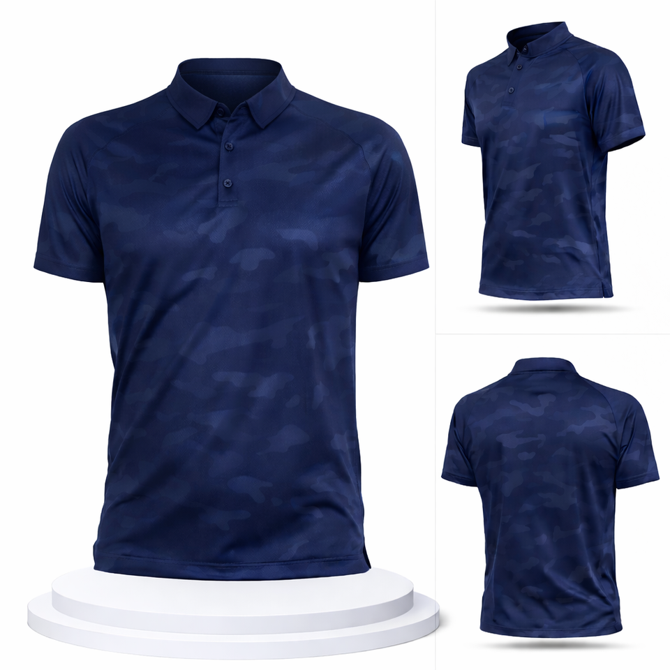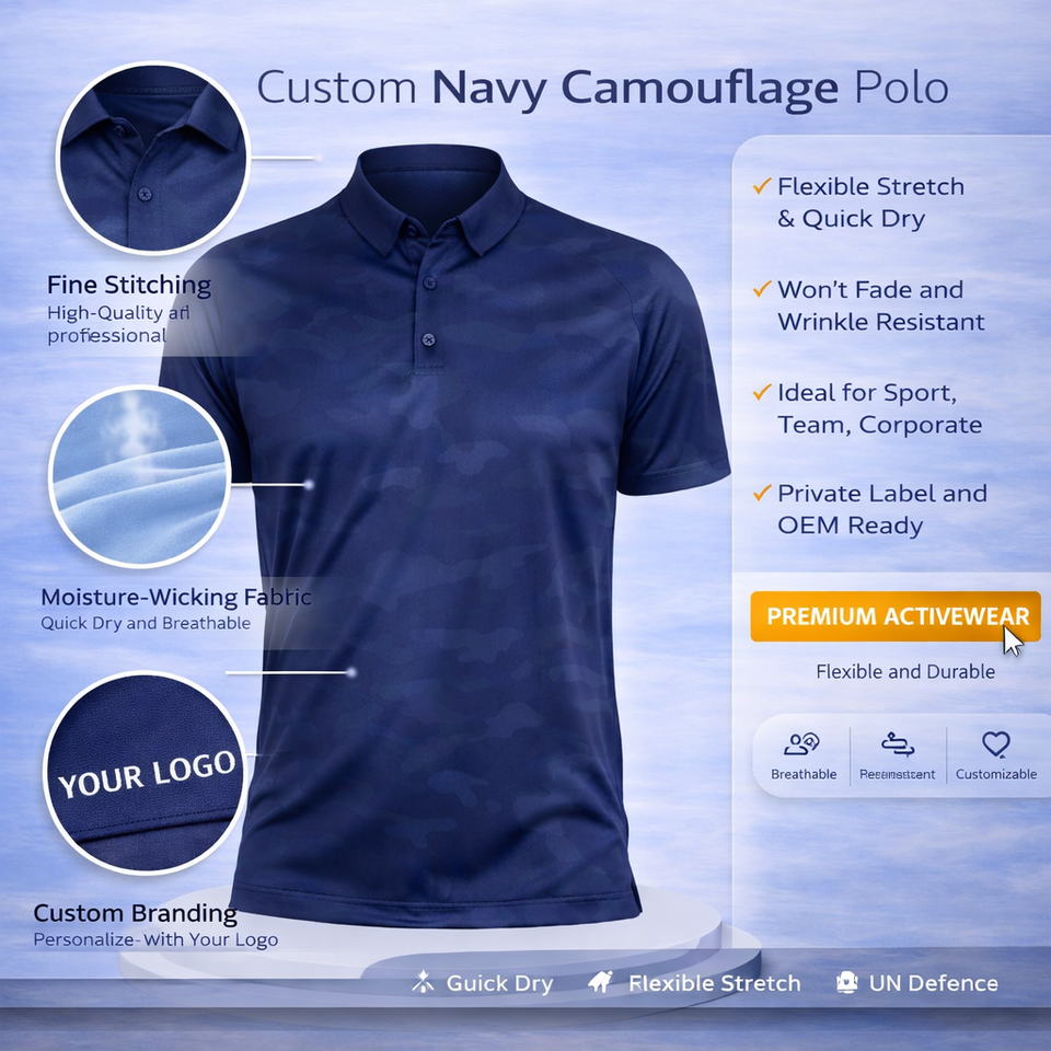 Camiseta Polo de Camuflaje para Hombre, Sublimada, de Poliéster y Elastano, con Estampado Completo, Estilo Táctico, Color Azul Marino, con Logotipo Personalizado