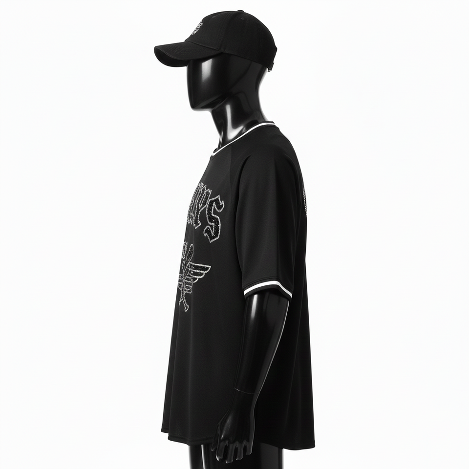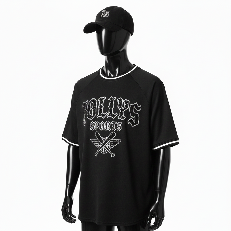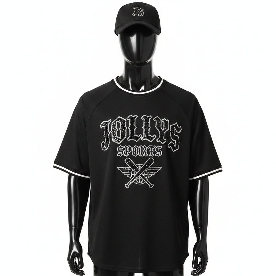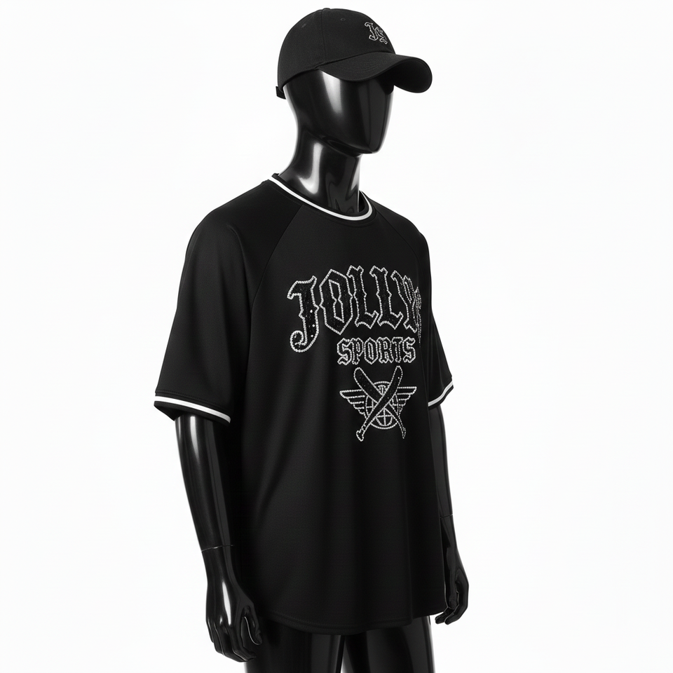 Camiseta de béisbol para hombre, tela de poliéster entrelazada, panel raglán, logotipo personalizado con pedrería, 100% algodón, corte holgado, estampada.