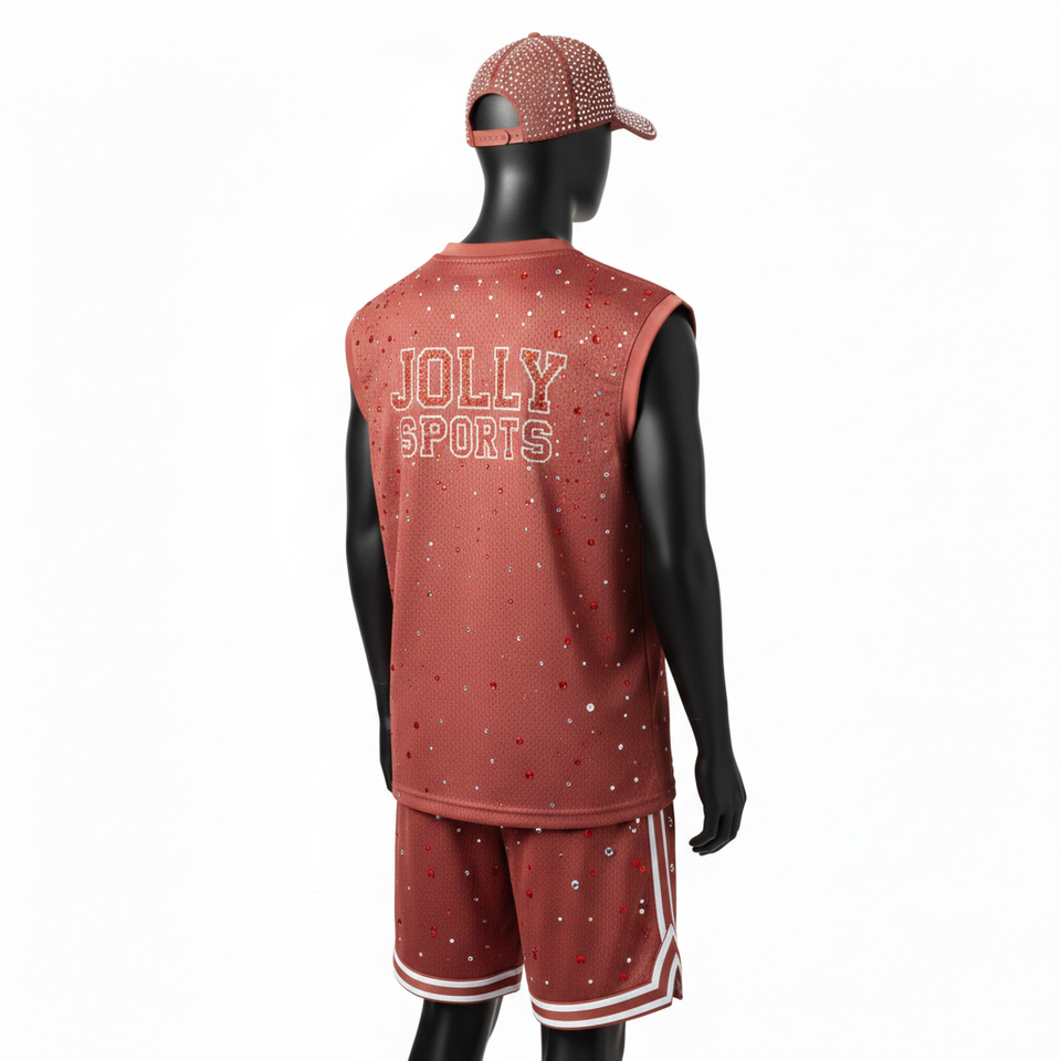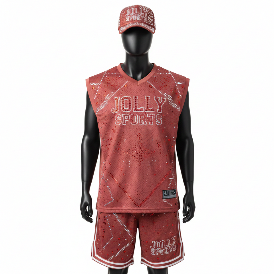 Conjunto de pantalones cortos de baloncesto para hombre, transpirable, de malla de poliéster de 180 GSM, diseño de panel rojo, con pedrería termoadhesiva y logotipo personalizado.
