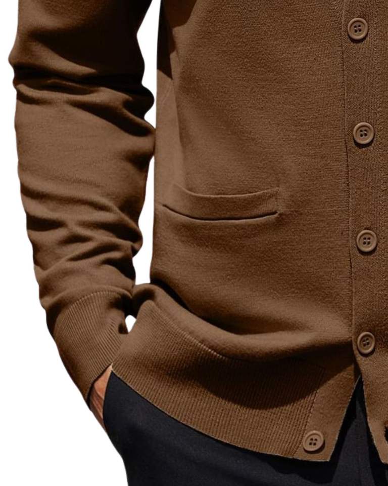 Suéter Cárdigan Clásico Marrón para Hombre con Cuello en V, Botones en la Parte Delantera, Tejido Suave, Ligero, Estilo Casual, Ropa de Moda