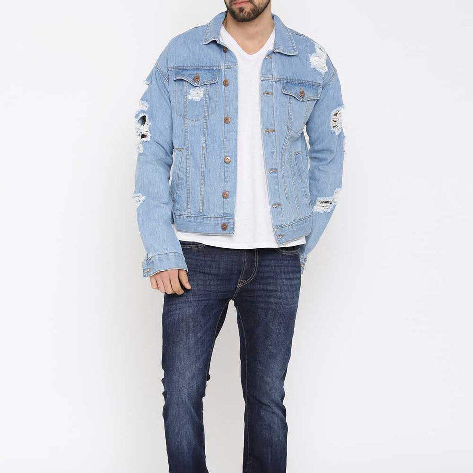 Chaqueta Vaquera Desgastada de Color Personalizado para Hombre, Manga Larga, Estilo Casual Vintage, Ropa Urbana Desgarrada, Secado Rápido, Transpirable, OEM