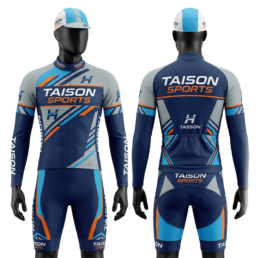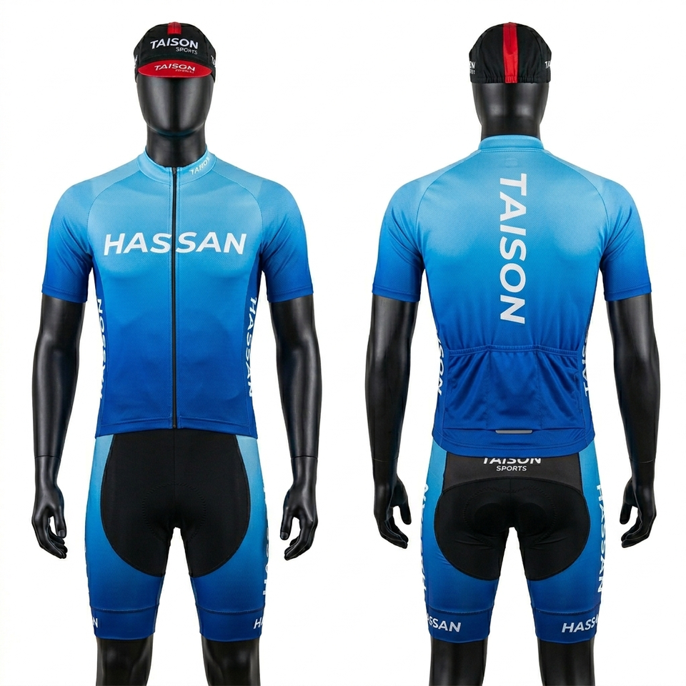 Uniforme de Ciclismo para Hombre, Poliéster y Spandex Premium, Diseño con Paneles en Degradado Azul, Jersey con Cierre y Pantalones Cortos Acolchados, Logotipo Sublimado Personalizado