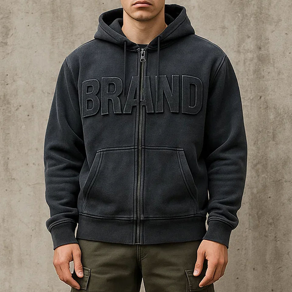 Sudadera con capucha y cremallera completa de gran tamaño vintage OEM con estampado en relieve de tela lavada desgastada para hombre