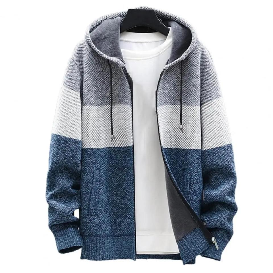 Abrigo con capucha para hombre Color Block tejido Otoño Invierno espesar forro de felpa cálido cárdigan suéter para oficina