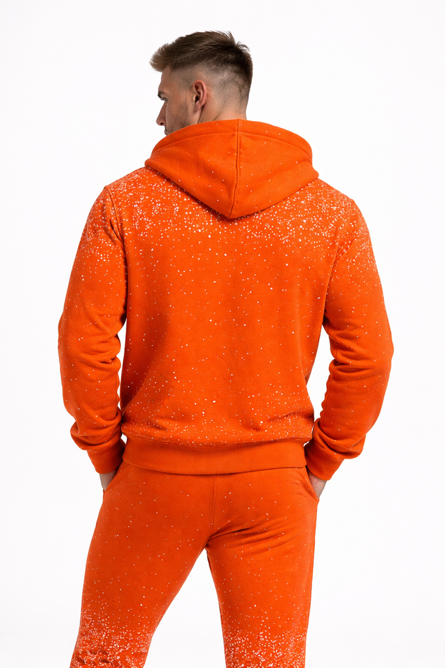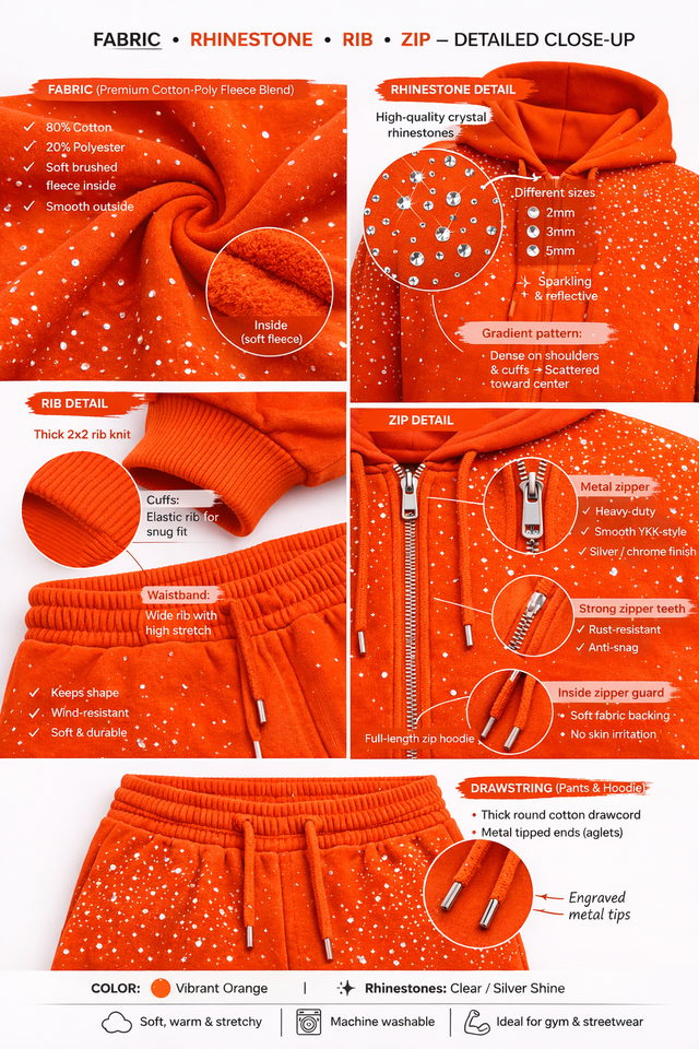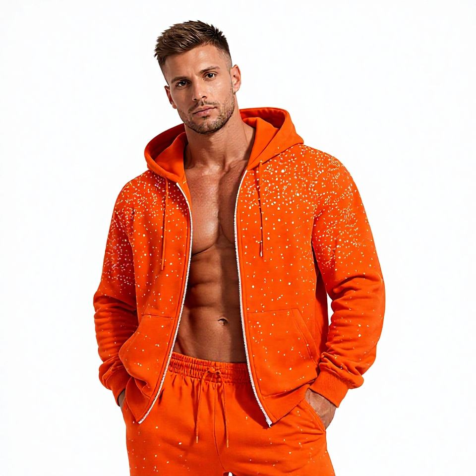 Conjunto deportivo de hombre con sudadera con capucha y pantalones de chándal con pedrería naranja brillante, con cremallera, estilo urbano, informal y deportivo.