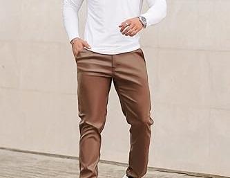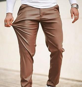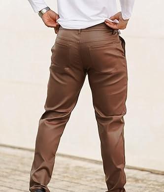 Pantalones de Cuero Genuino Color Marrón Liso para Hombre, Cintura Alta, Corte Regular, Estilo Recto, Cierre de Cremallera Sin Tejido, Antiarrugas