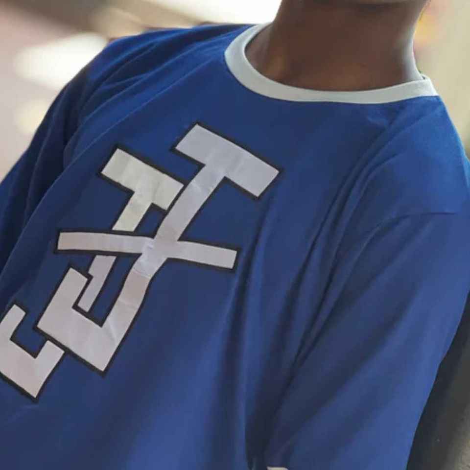 Camiseta Ringer Azul Rey para Hombre con Cuello y Mangas en Contraste Blanco, Logotipo Bordado en Chenille Personalizado, Algodón, Suministro al por Mayor OEM