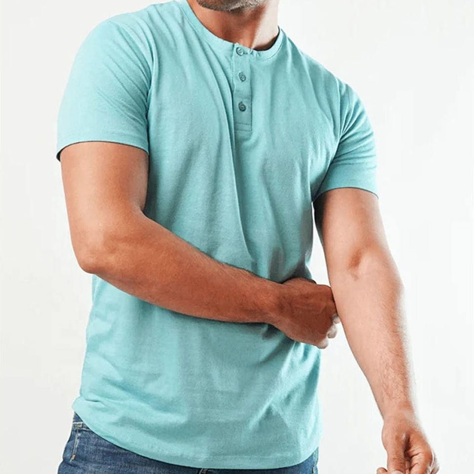 Camiseta de manga corta para hombre, color azul, tela de poliéster cómoda, cuello redondo con cierre de botones, camiseta informal clásica para hombre