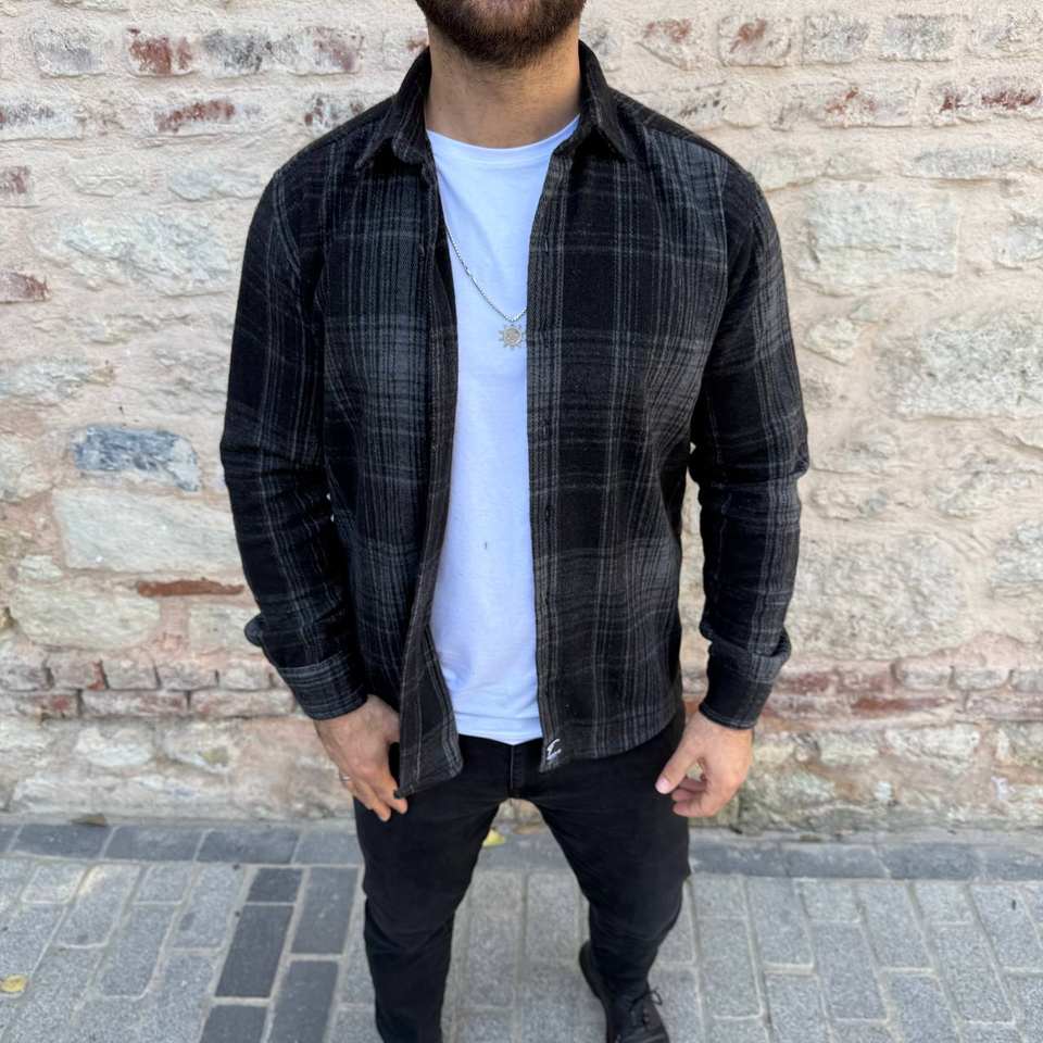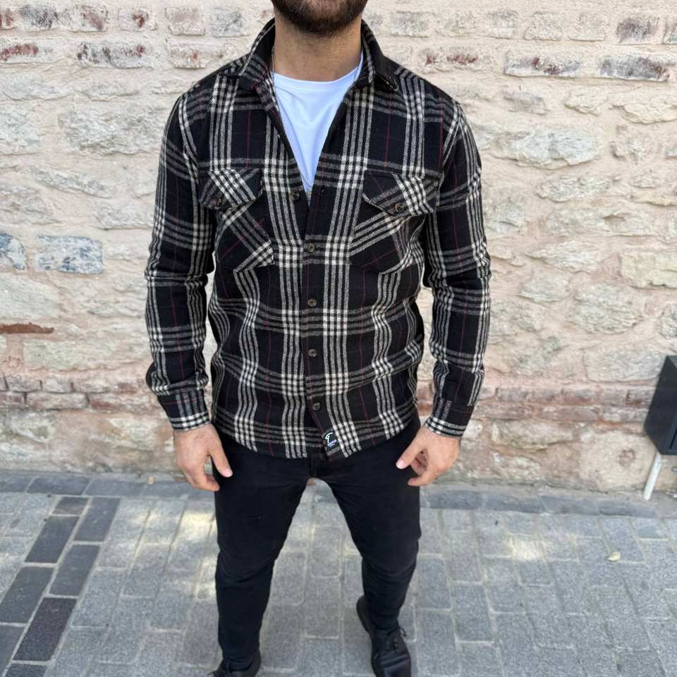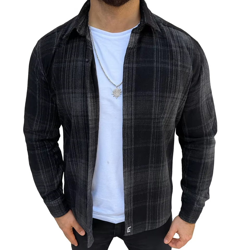 Camisa de Hombre Estilo Casual Elegante, Manga Larga, Satén, Doble Botonadura, Estampado a Cuadros, Estilo Urbano, Ecológica