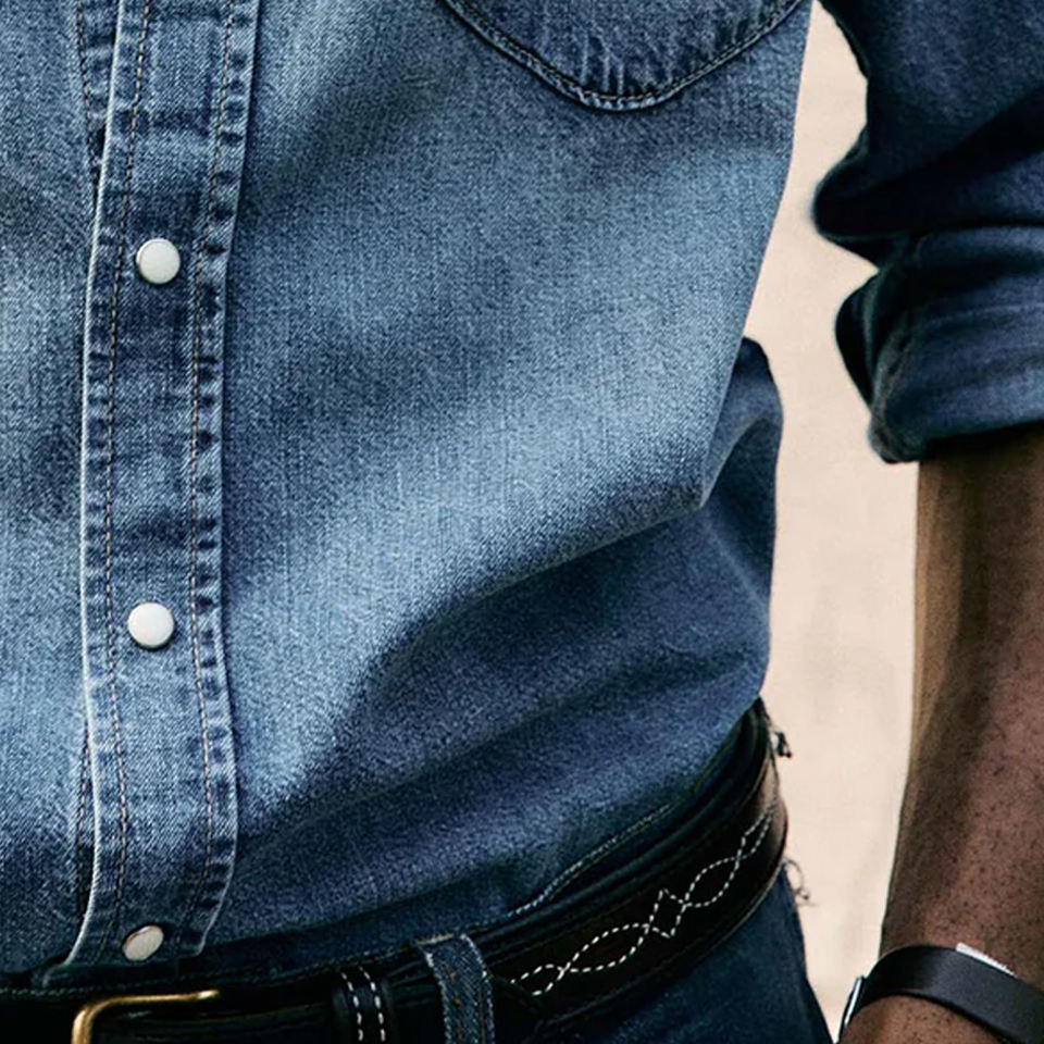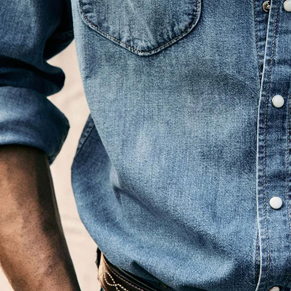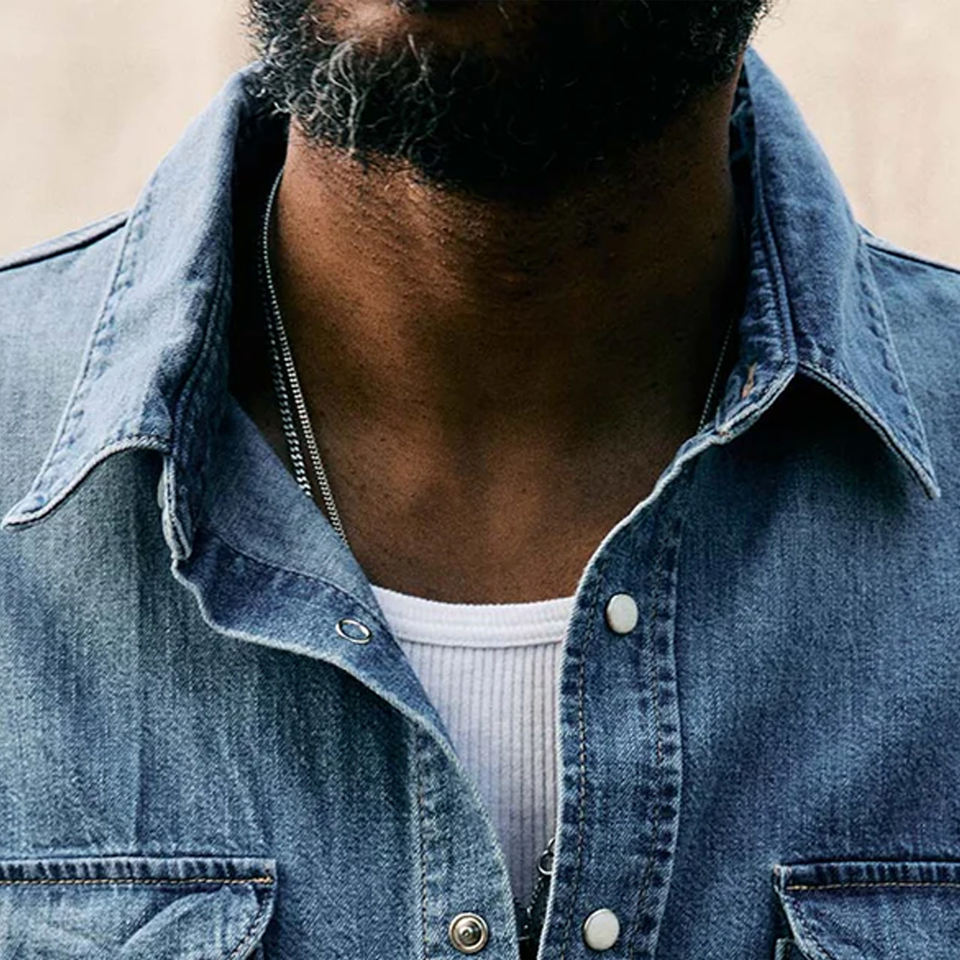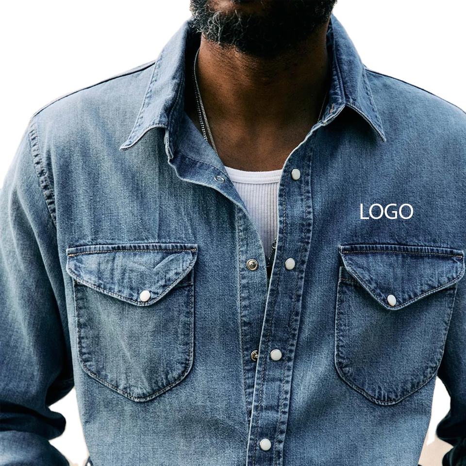 Camiseta básica elegante para hombre con abertura de botones y cuello clásico, material vaquero, diseño relajado con logo y bolsillos frontales
