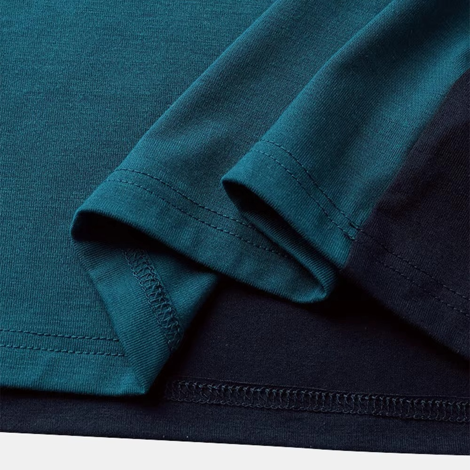 Camiseta de algodón para hombre, color azul marino y verde, con diseño de bloques de color, bolsillo, manga corta, cuello redondo, estilo casual urbano, logotipo personalizado, venta al por mayor