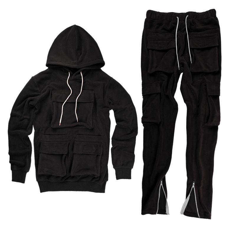 Hombres bolsillos gruesos logotipo personalizado algodón poliéster 2 piezas Conjunto sudadera hombres Cargo alta calidad transpirable bolsillos pantalón chándal