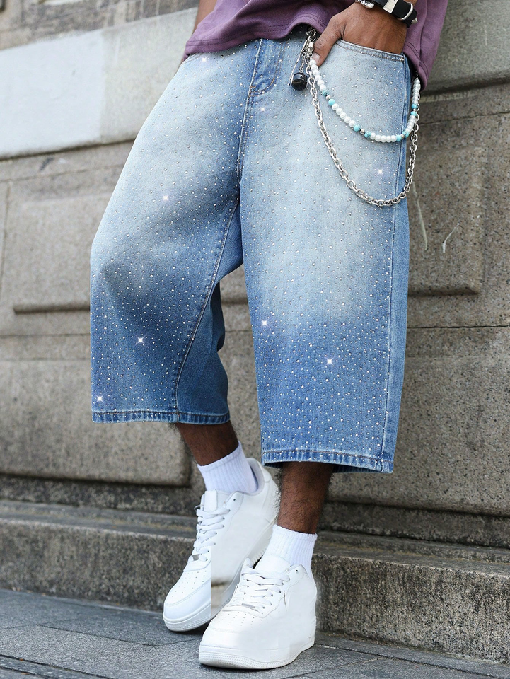 Pantalones Cortos de Mezclilla para Hombre, 100% Algodón, con Pedrería, Lavado Ácido, Estilo Urbano Holgado, Hip Hop, Largos hasta la Rodilla, Verano, Personalizados