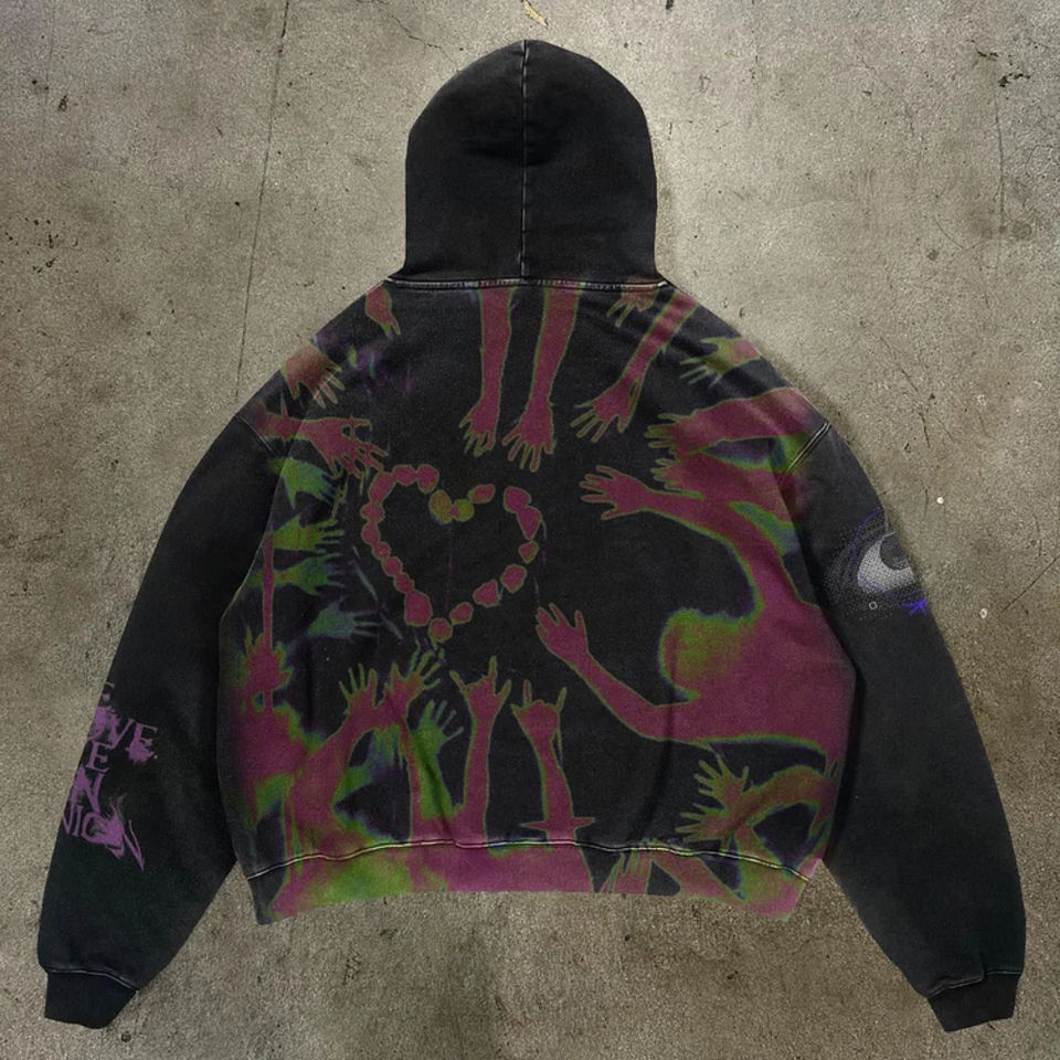 Sudadera con capucha de lavado ácido para hombre, sudadera térmica de fiesta de invierno con diamantes de imitación, ajuste cuadrado, 500gsm, peso pesado, apliques desgastados, parche, Sudadera con capucha de fiesta