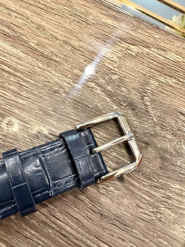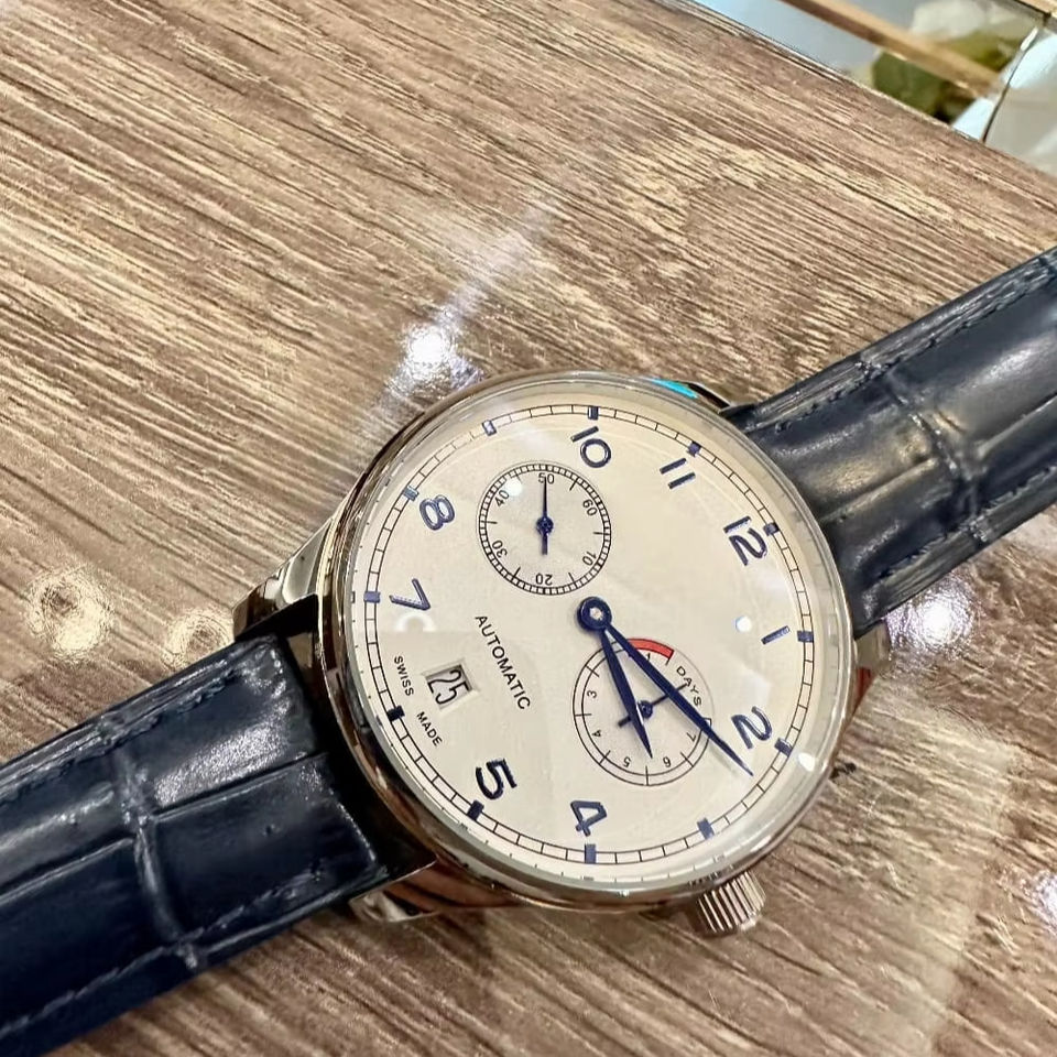 Reloj automático para hombre con esfera color crema, indicador de reserva de energía y correa de cuero azul para uso formal e informal