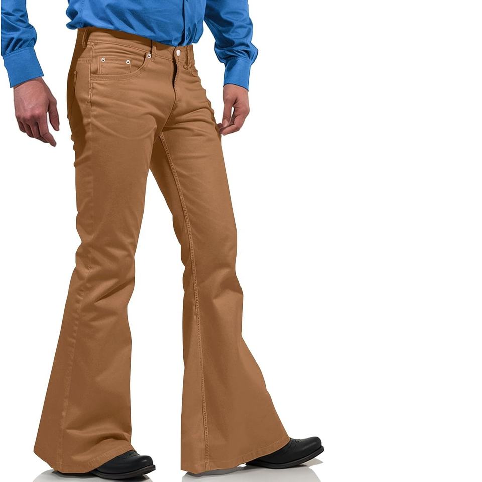 Pantalones de campana para hombre 70s 60s Trajes para hombre Vintage Bell Bottom Denim Jeans para hombre Azul oscuro y marrón