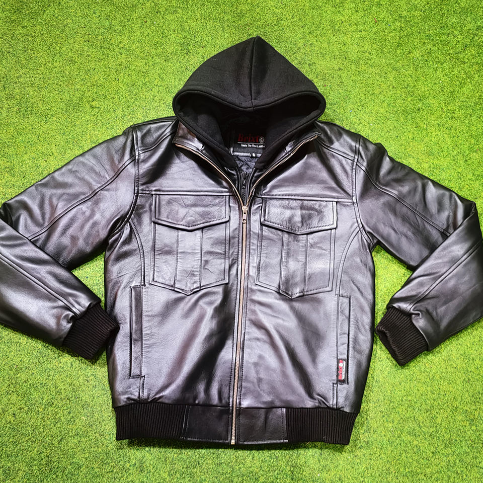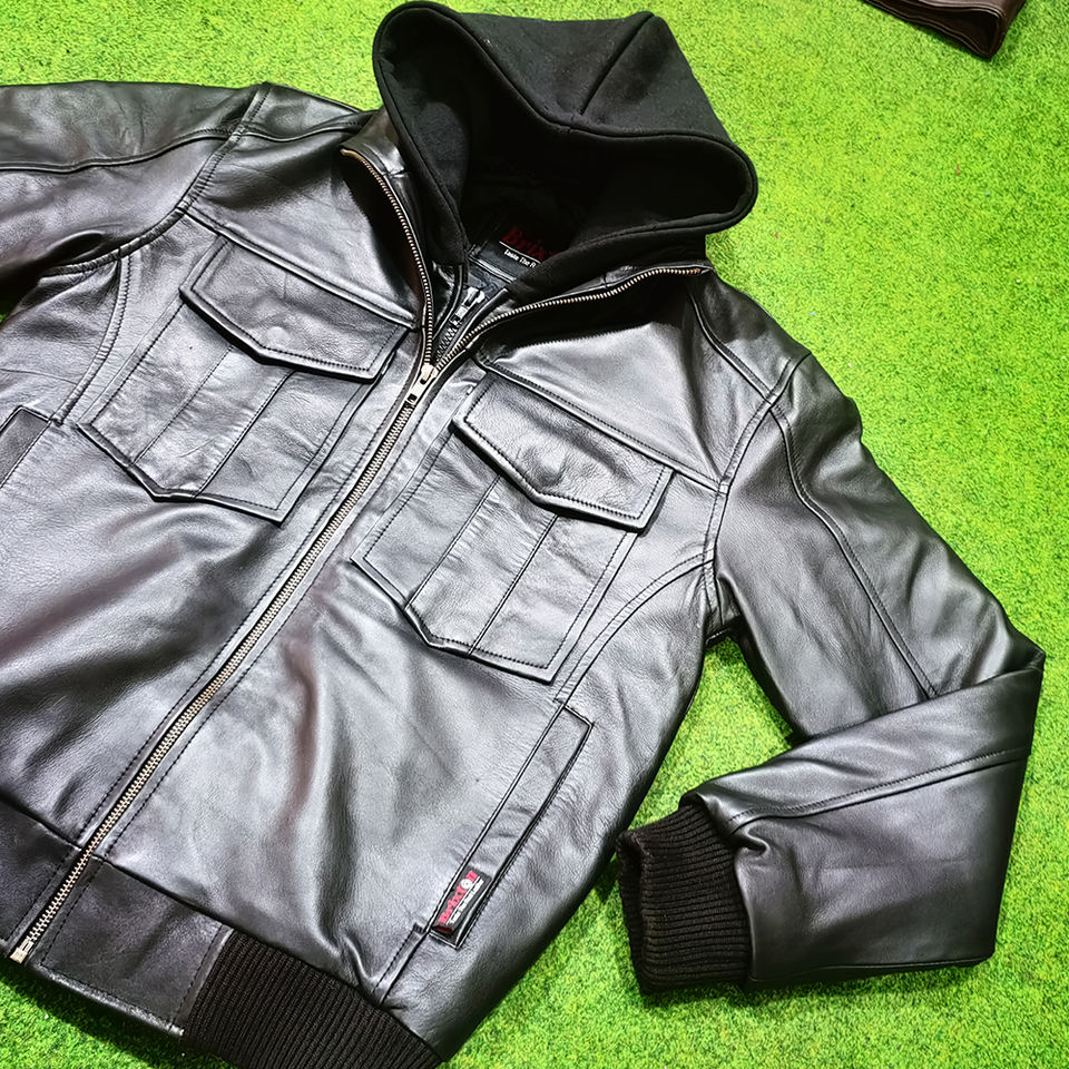 Product name:Men's Black Genuine Sheepskin Hooded Leather Biker Jacket