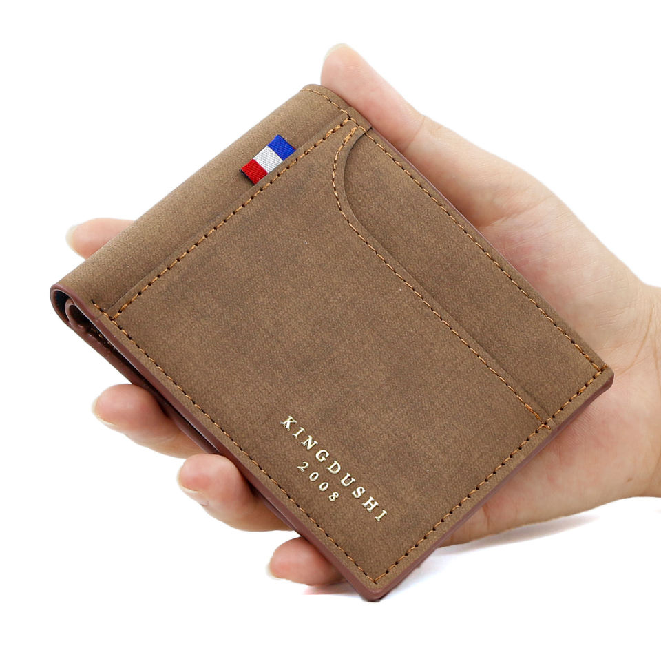 Billetera de Negocios para Hombre Multifuncional de Dos Pliegues Color Arena con Espacio para Billetes, Logo Dorado Claro y Diseño Ligero