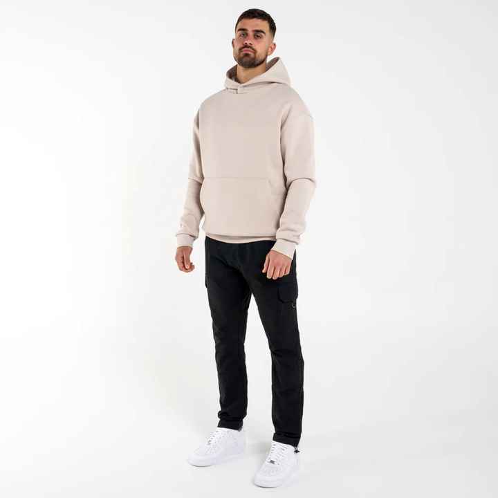 Sudadera con capucha lisa de ajuste relajado de cemento para hombre: uso diario cómodo con puños elásticos y capucha con cierre a presión