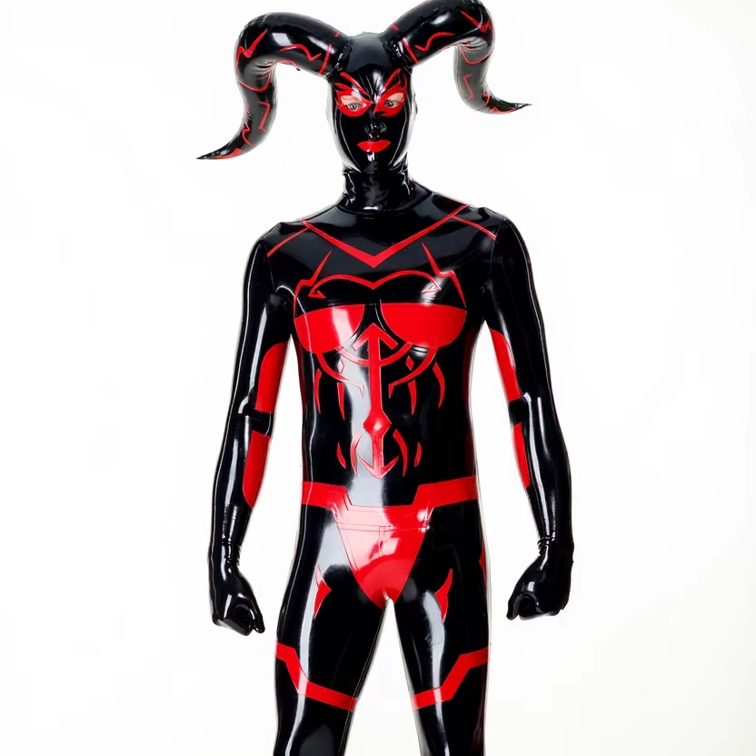 Disfraz de Látex Negro con Cuernos Inflables 'Cernunnos' y Pechos para Hombre, con Capucha y Guantes con Ribete Rojo