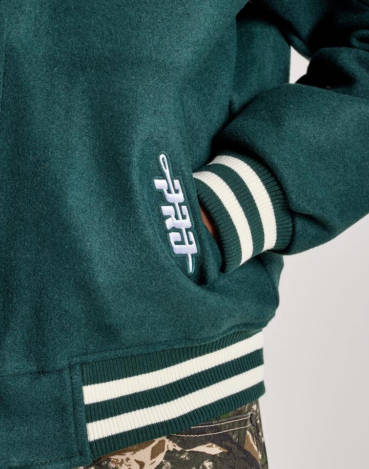 Chaqueta de béisbol universitaria para hombre para invierno lona Letterman mangas de cuero de vaca cuello alto bordado decoración estilo infantil