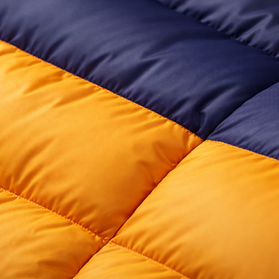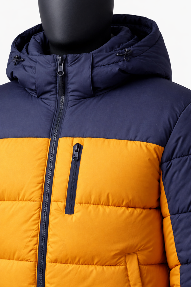 Chaqueta Acolchada con Capucha para Hombre, Diseño Color Block, Azul Marino y Amarillo, Chaqueta de Invierno Acolchada, Fabricante Mayorista OEM ODM Personalizado