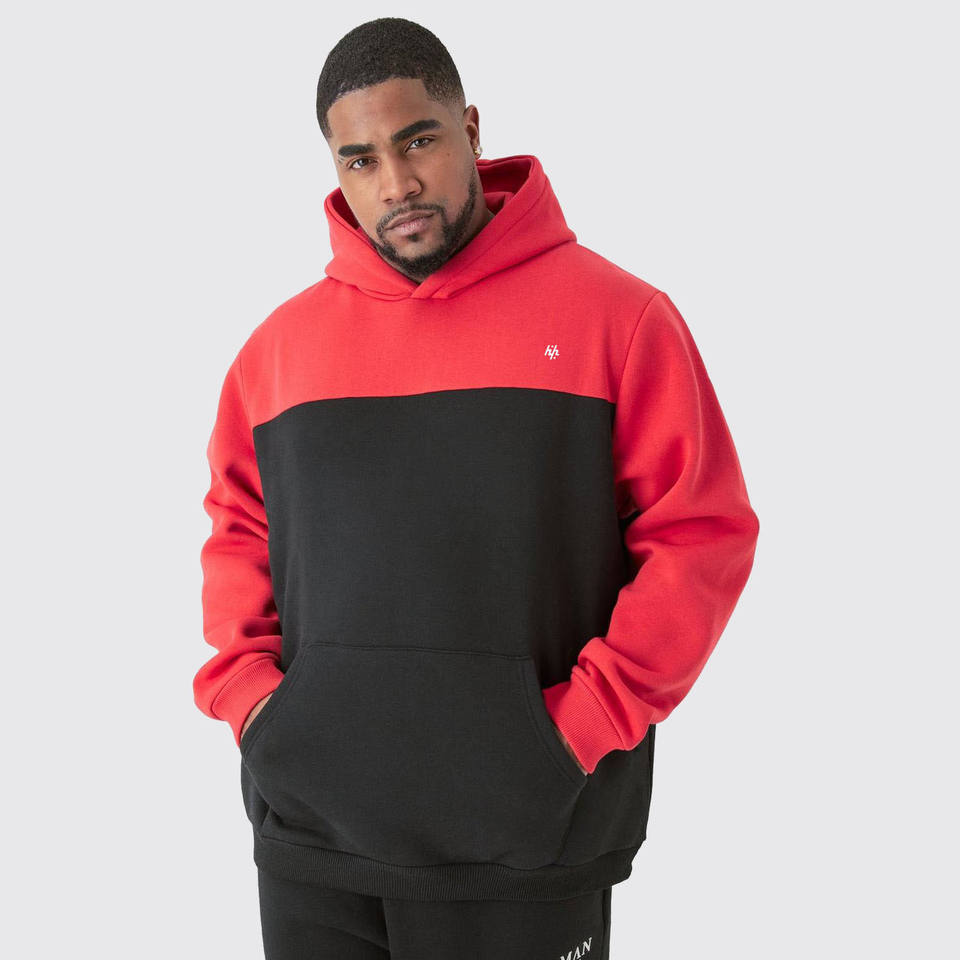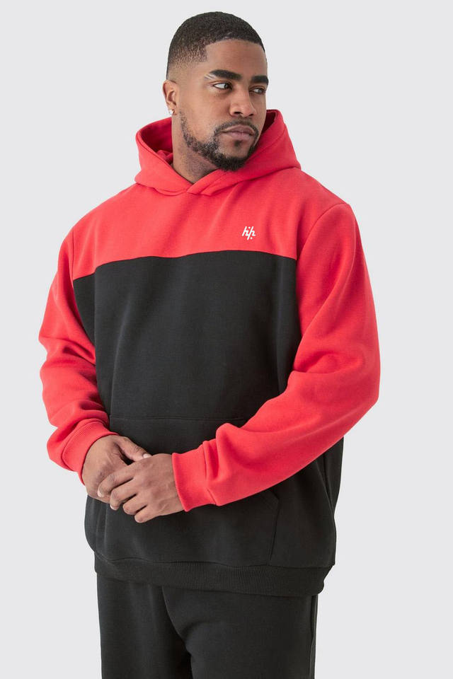 Sudadera con capucha de bloque de color de estilo informal para hombre en tela acogedora roja y negra con bolsillo frontal Everyday Comfort Washed Technics