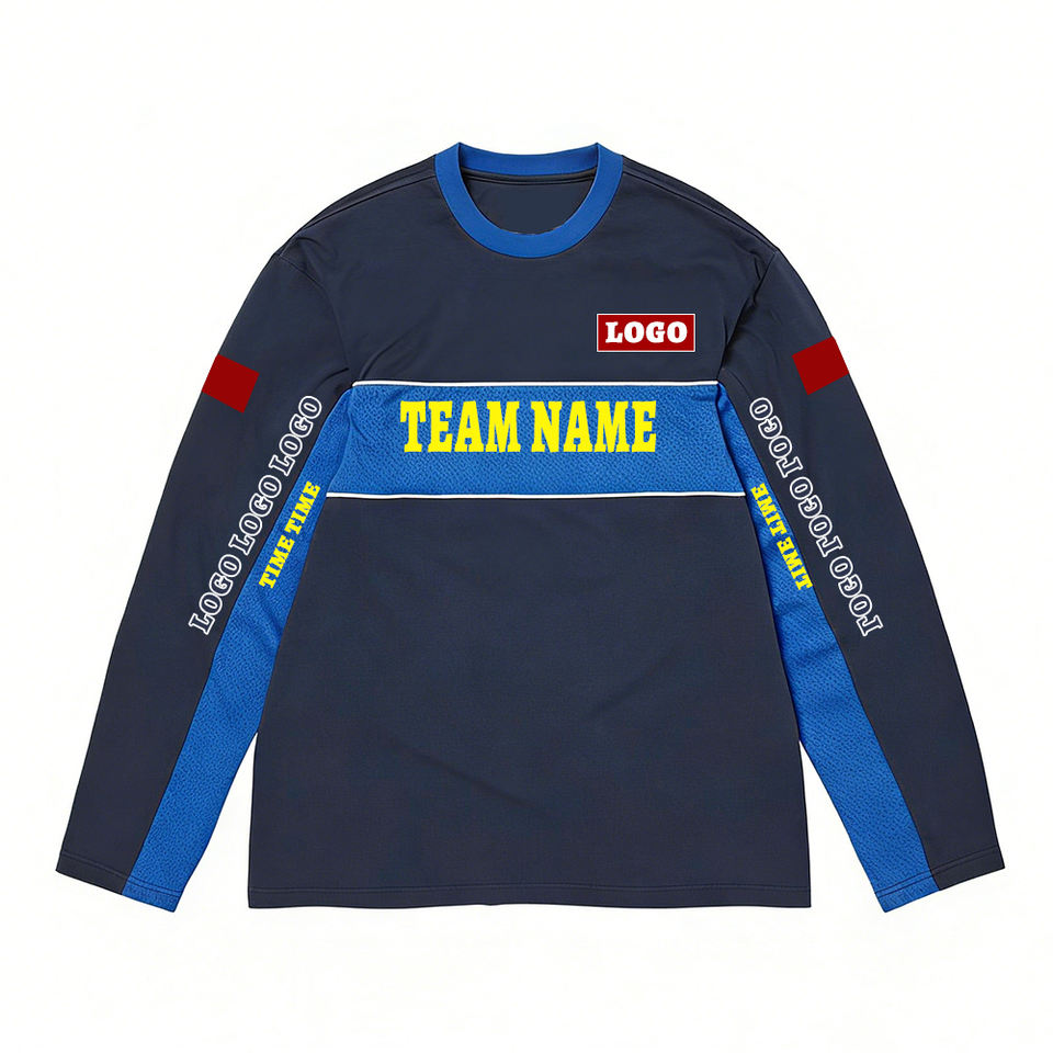 Camiseta de manga larga para hombre con bloques de color, paneles laterales de malla, nombre de equipo personalizado, cuello redondo, transpirable, ajuste holgado, estilo casual urbano, ODM OEM