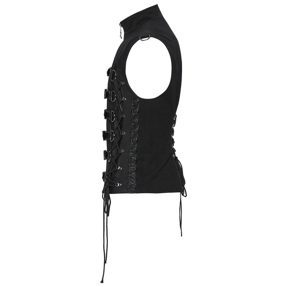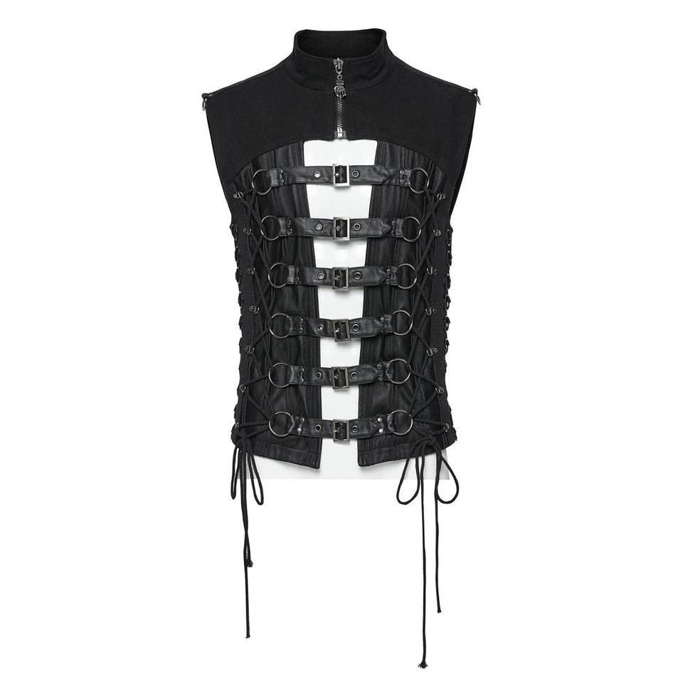 Chaleco gótico punk negro personalizado para hombre con hebilla, diseño hueco, corte medio, detalles de anillo en O, el más vendido 2026