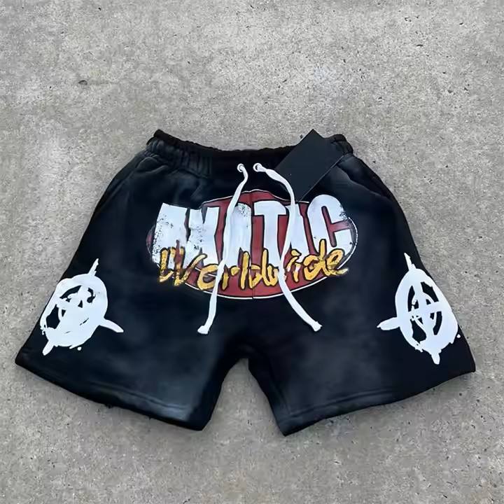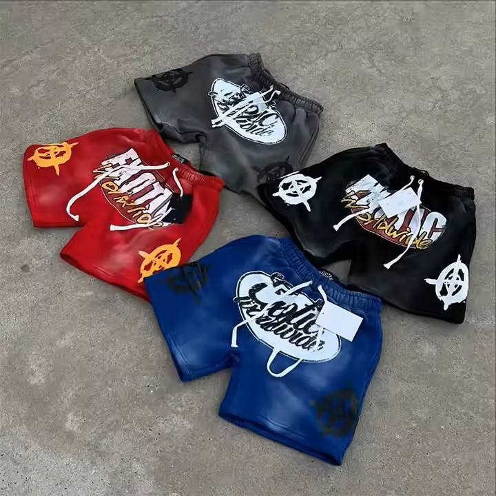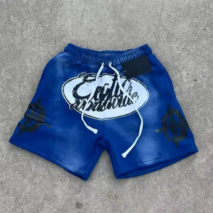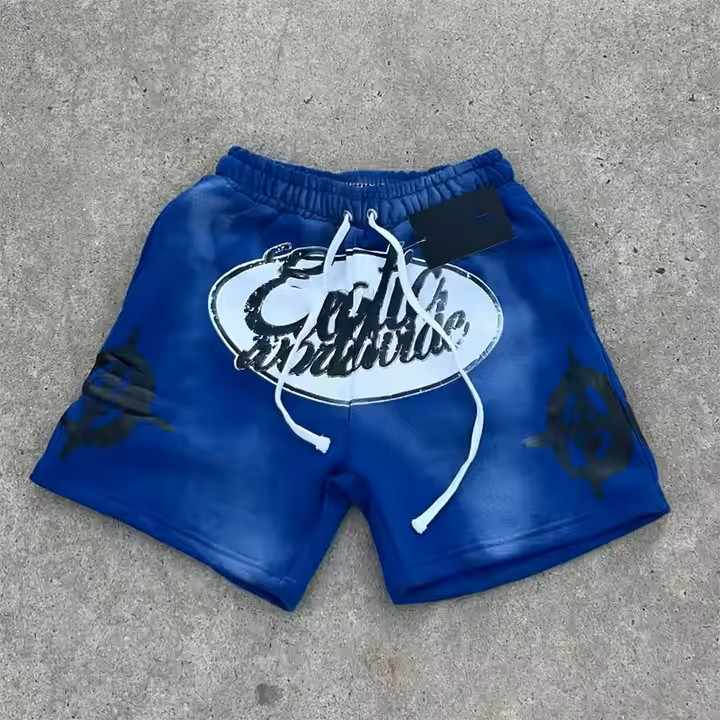 Pantalones cortos de algodón con bordado desgastado para hombre, pantalones cortos de gimnasio transpirables de cintura media con logotipo personalizado y borde cortado desteñido