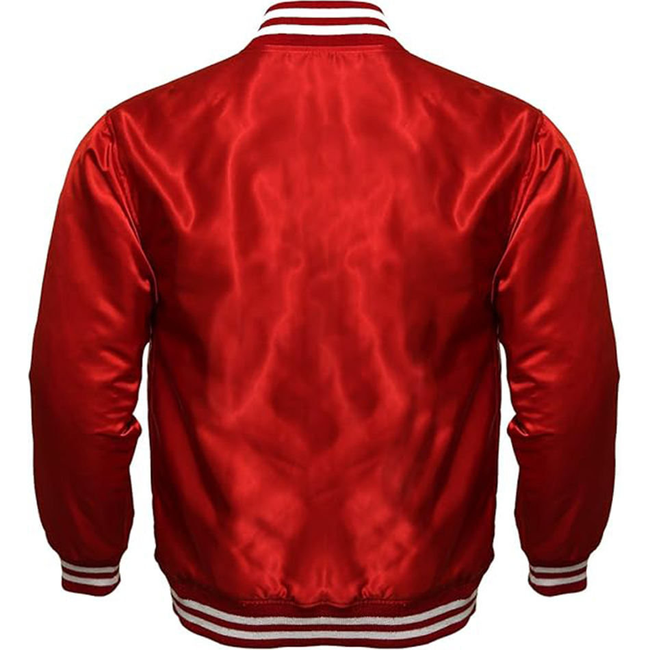 Chaqueta Universitaria Exclusiva para Hombre en Satén Blanco con Cierre Completo, Logotipo Personalizado Impreso, Cuello Alto, Material de Lona para Baloncesto