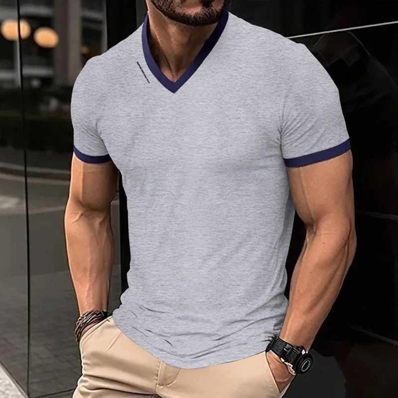 Camiseta de manga corta con cuello en V de color liso, informal y a la moda para hombre, con estampado de letras, top versátil y cómodo para verano