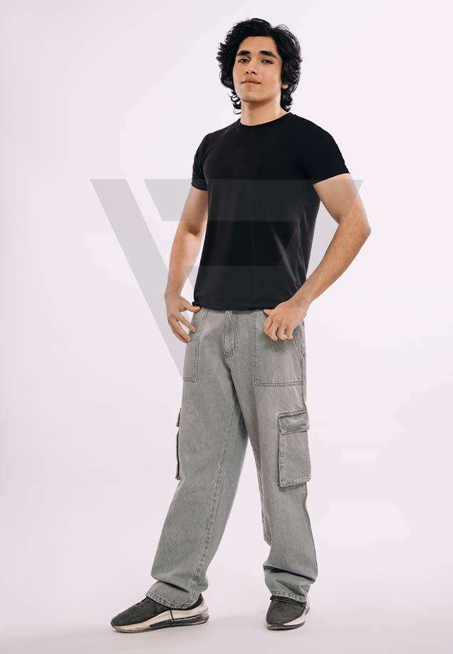 Pantalones vaqueros cargo holgados de corte recto gris para hombre, cuatro bolsillos delanteros y traseros, cintura media, decoración de logotipo lavado con luz desgastada