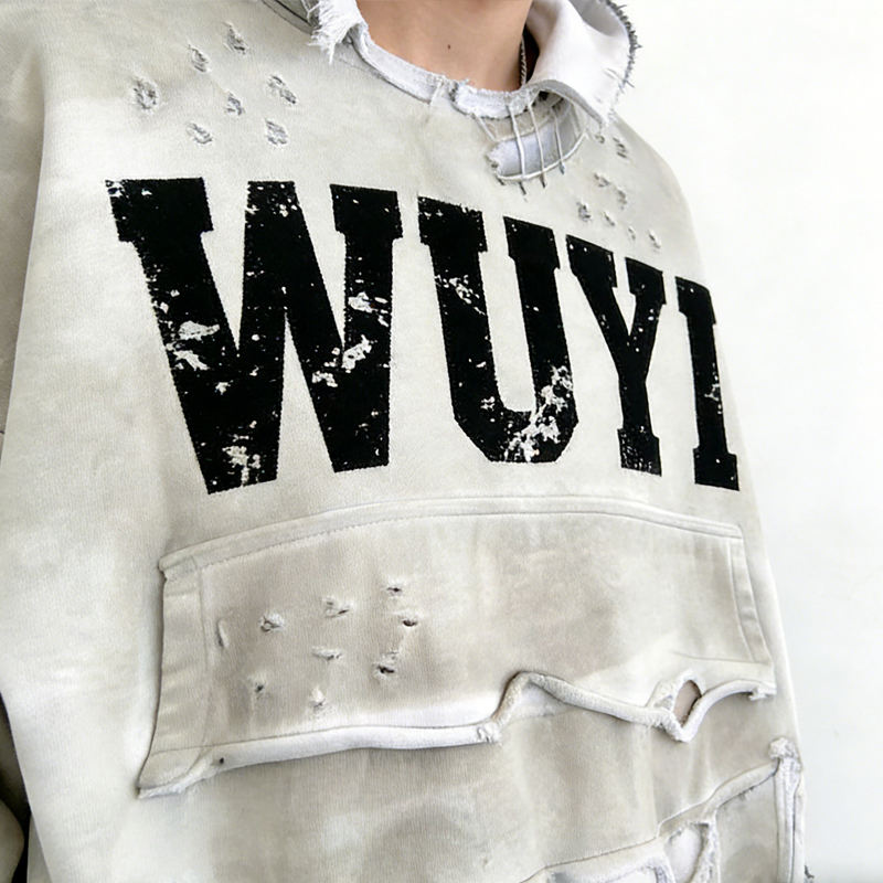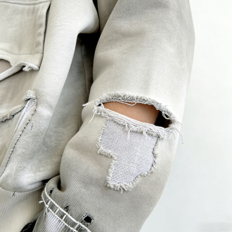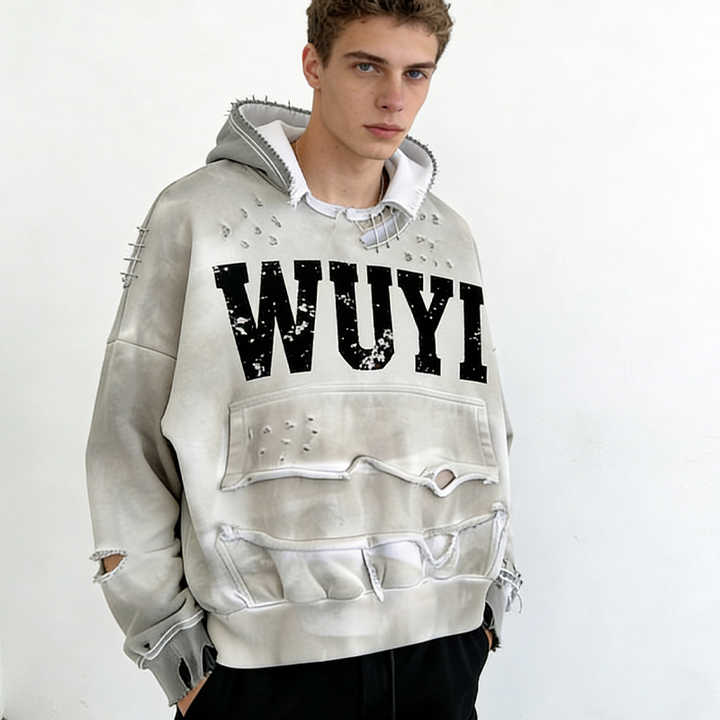 Sudadera con capucha de invierno para hombre, con cremallera de un cuarto, estilo americano urbano, diseño vintage con remaches y rasgaduras, mezcla de algodón, corte regular, con lavado pesado y efecto desgastado
