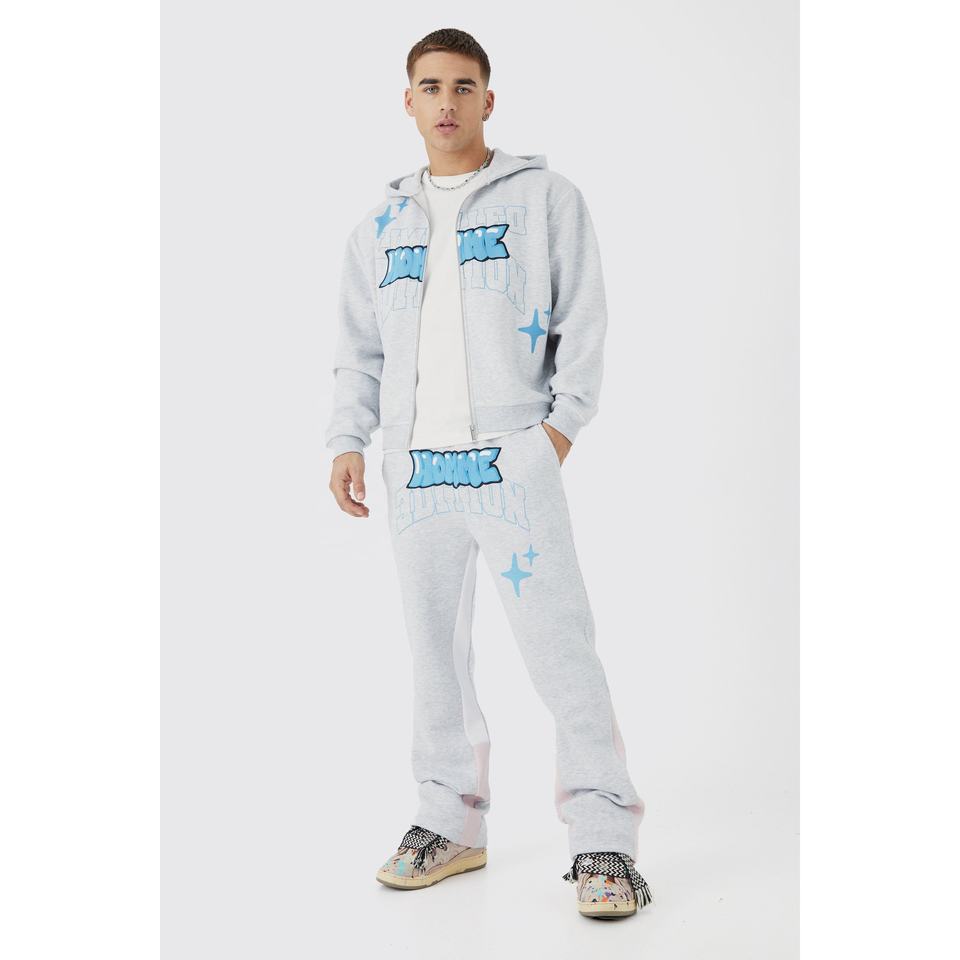 Heavyweight New Flare Design Sweatsuit Screen Print Zip Hoodie y Flared Sweatpants Set para hombre