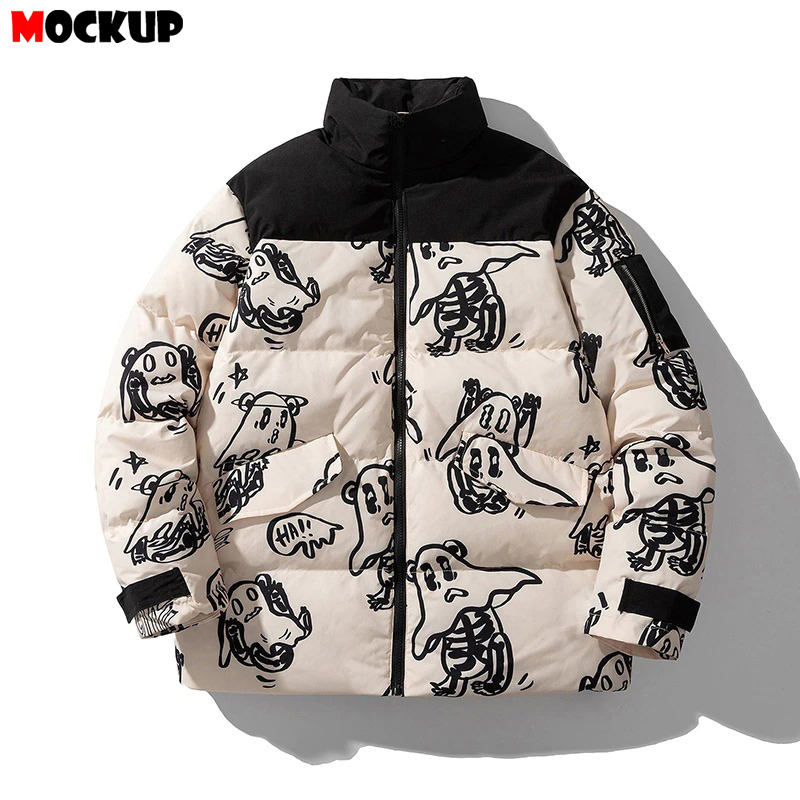 Chaqueta acolchada de algodón de estilo callejero para hombre para invierno abrigo de burbujas grueso con estampado divertido y cuello levantado
